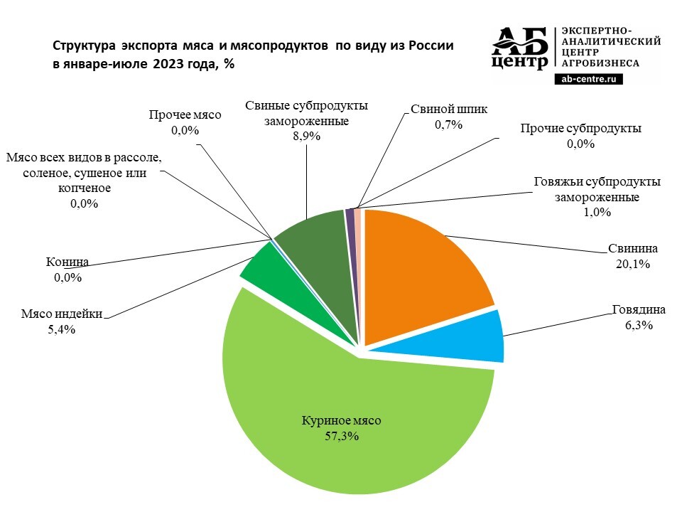 В структуре экспортных поставок мяса и мясопродуктов, по оценкам АБ-Центр, в январе-июле 2023 года наиболее ощутимую долю занимают куриное мясо - 57,3% и свинина - 20,1%. На долю свиных субпродуктов пришлось 8,9% от общего объема поставок, на говядину - 6,3%, на мясо индейки - 5,4%.