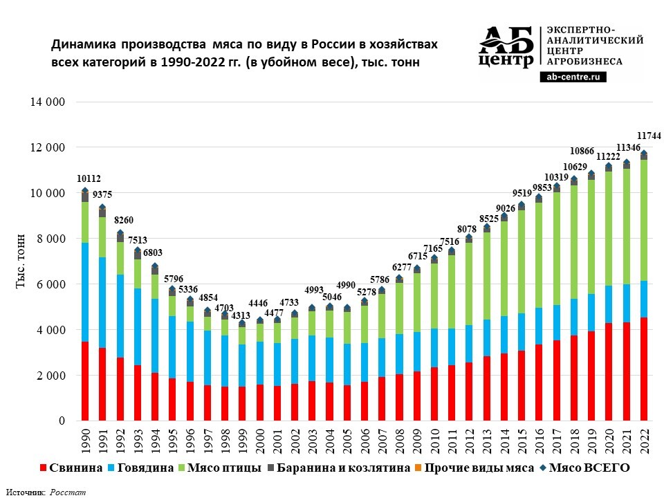 Производство мяса всех видов в 2022 году, по уточненным данным Росстата, составило 11 744,2 тыс. тонн в убойном весе, что на 3,5% (на 398,0 тыс. тонн) больше, чем в 2021 году.